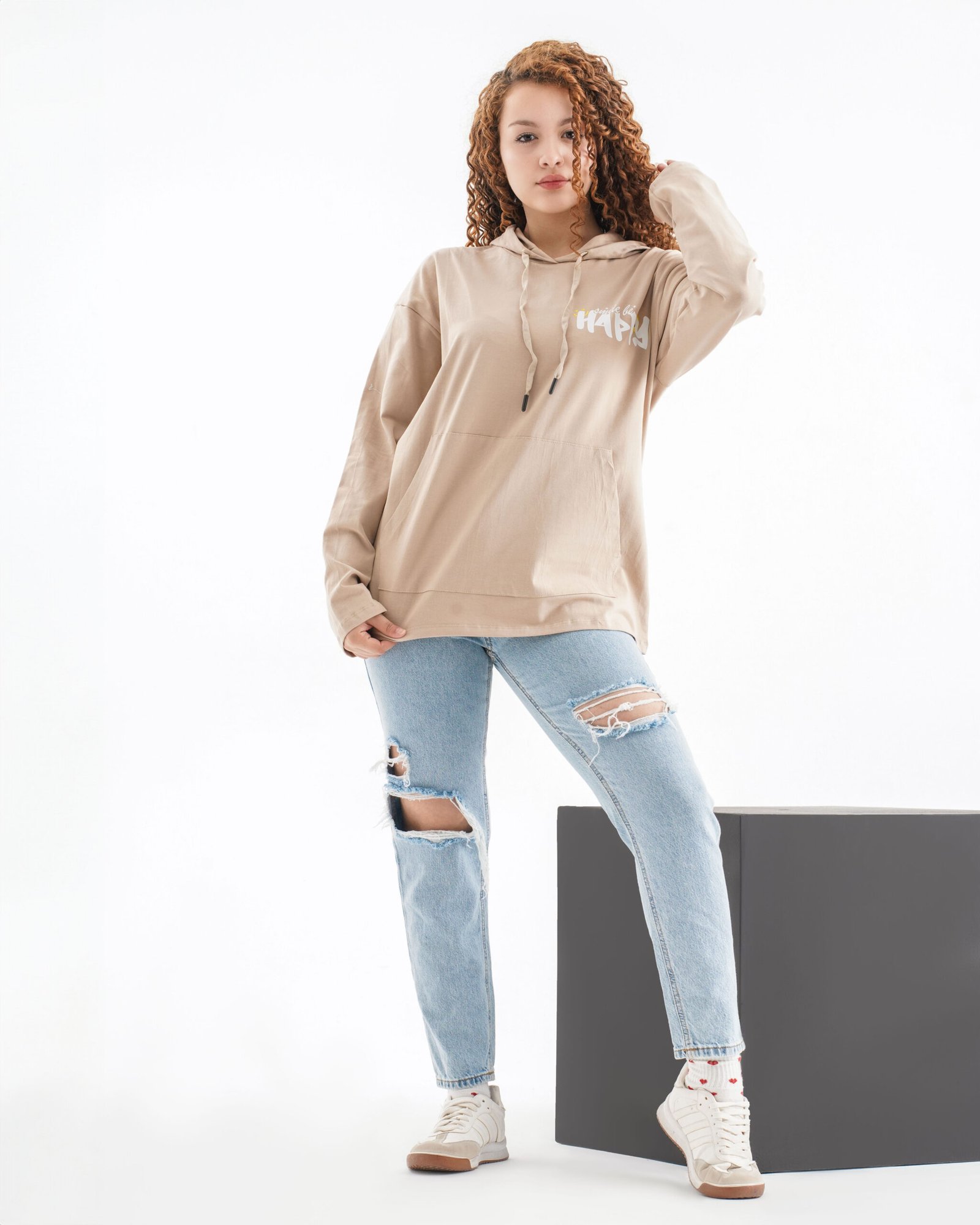 Happy State Long Sleeve Hoodie – Sand Beige (Smiley Graphic Print)