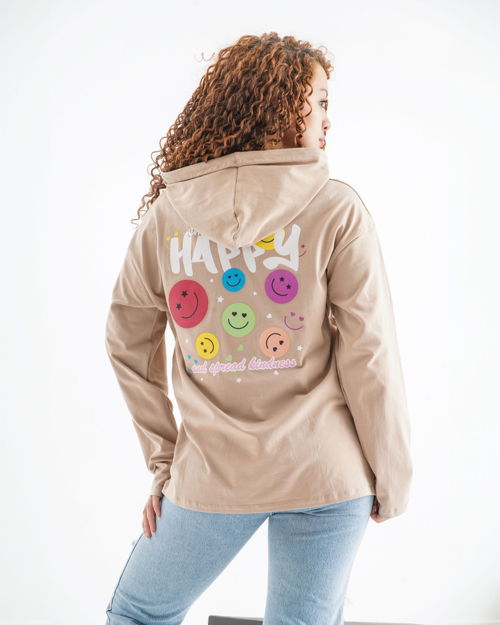 Wrap yourself in feel-good vibes with the Happy State long sleeve hoodie—a celebration of positivity, playfulness, and color. This cozy sand beige hoodie features cheerful typography that reads “Smile Big, Be Happy” on the front, with a vibrant burst of multicolored smiley faces on the back, surrounded by stars and a soft call to action: “and spread kindness.”