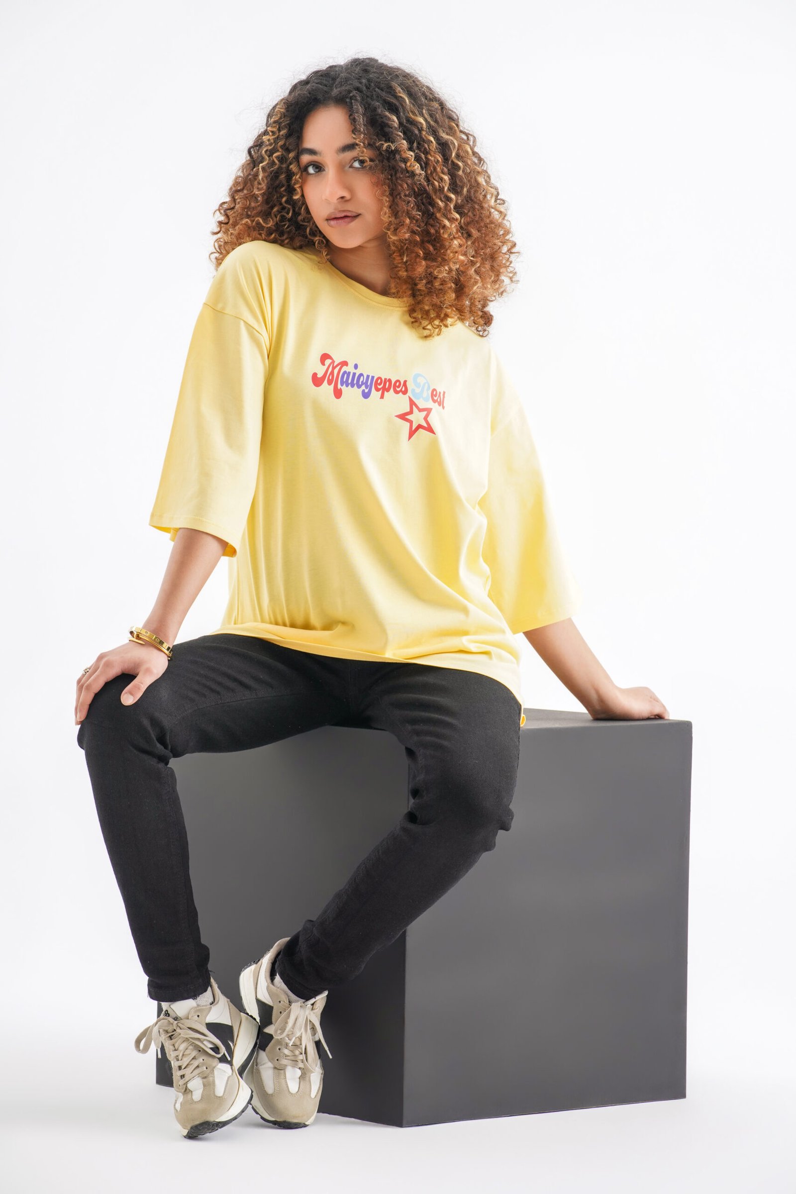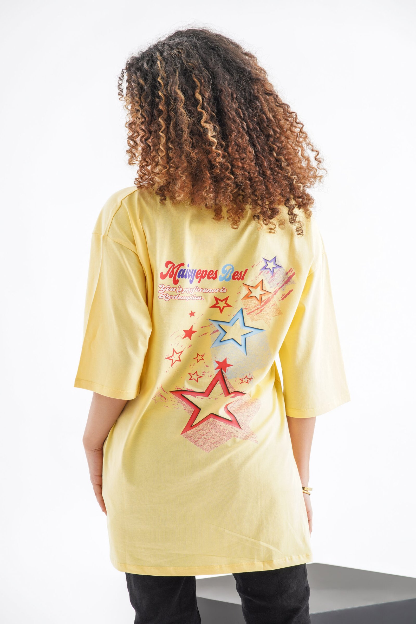 Bring a burst of vibrant energy to your wardrobe with the Maicyepes Best Oversized T-Shirt in a playful soft yellow. This standout piece captures the spirit of youthful joy and expressive style with its bold front logo and captivating star-themed back design.