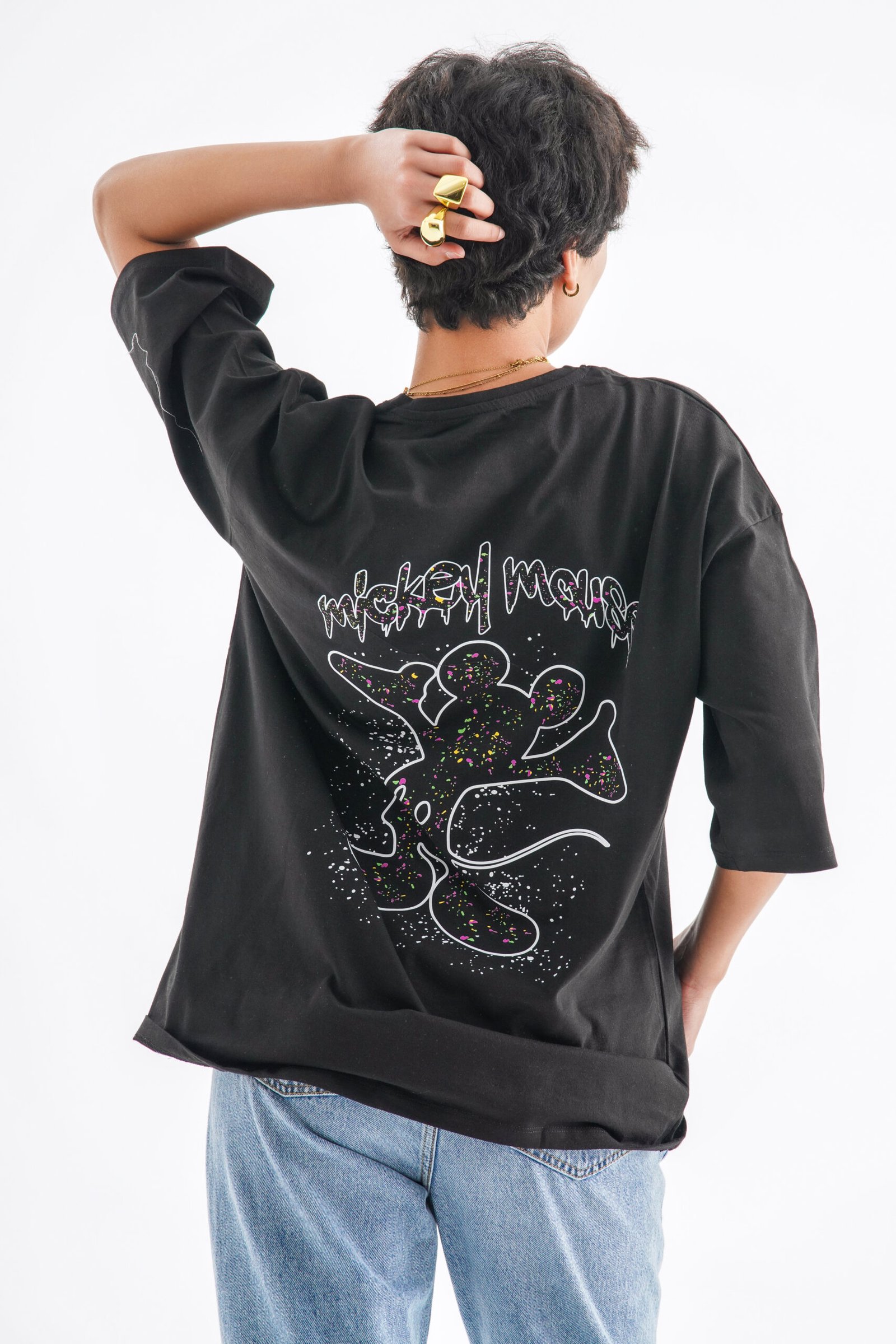 This black oversized T-shirt combines Disney nostalgia with bold, artistic flair. On the front, a small abstract Mickey silhouette adds a subtle, modern twist. The back features a large, eye-catching graphic of Mickey Mouse’s silhouette in a cosmic splatter pattern with the text “Mickey Mouse” in edgy, graffiti-style lettering.