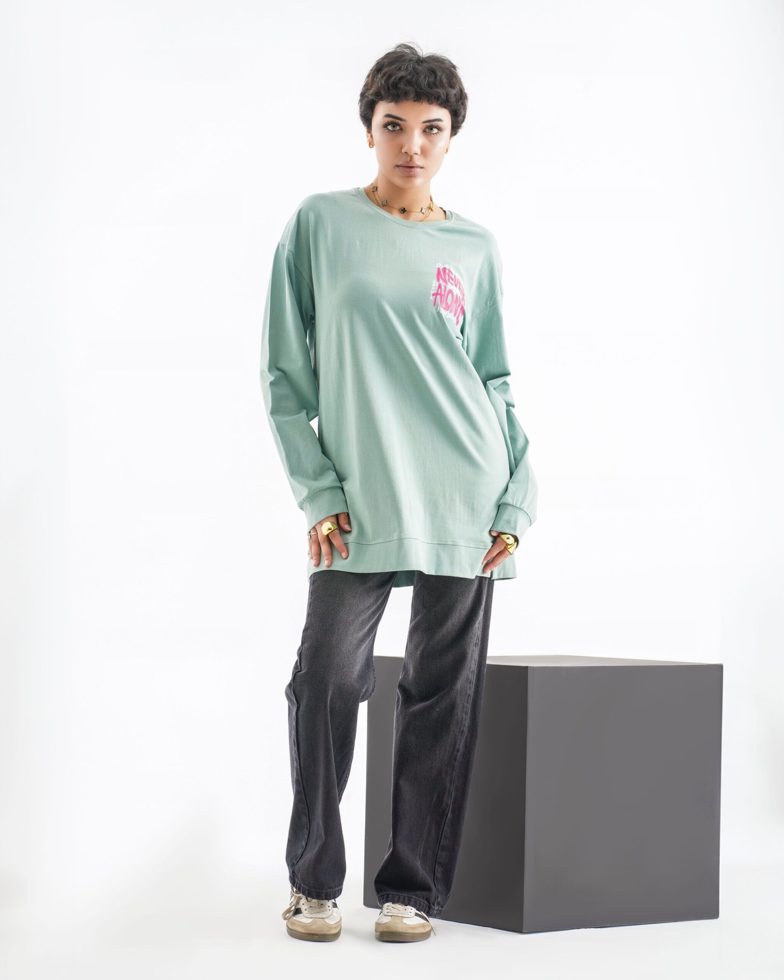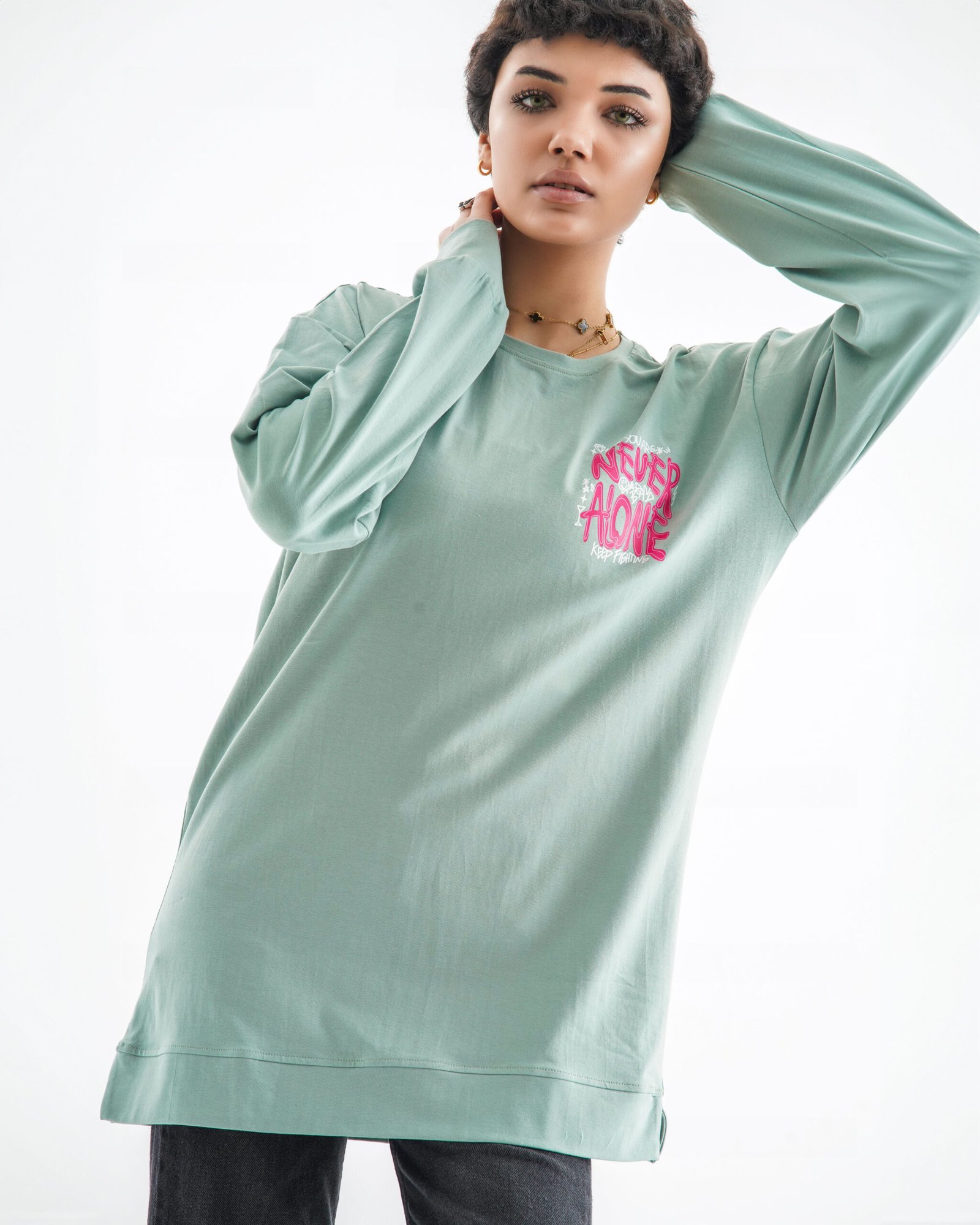 Never Alone Long Sleeve Shirt – Mint Green (Back Graphic Text Art)
